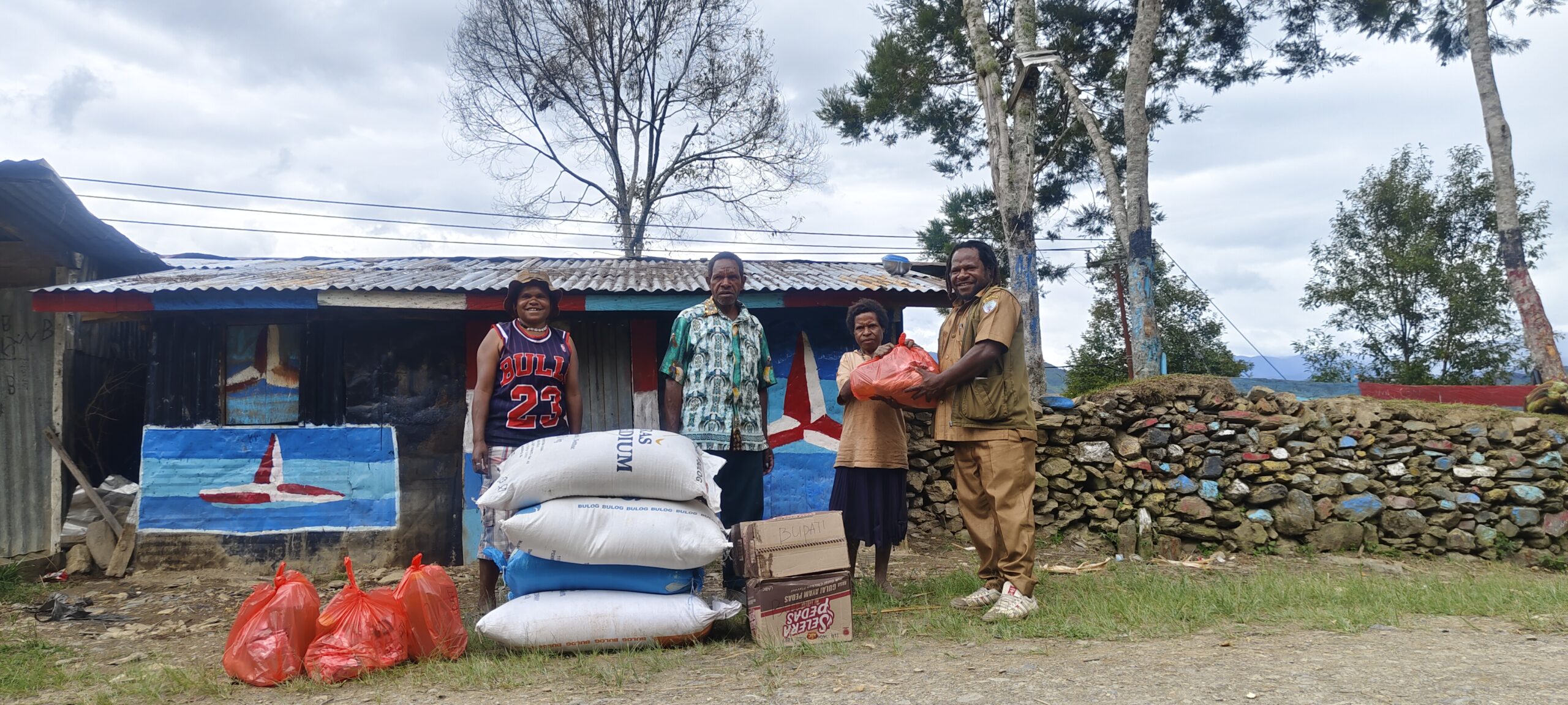 Bupati Tolikara Willem Wandik, S.Sos melalui Kepala Dinas Sosial Kabupaten Tolikara Andrus Kogoya, S.Sos, mengatakan bahwa bantuan tersebut meliputi beras empat sak (masing-masing 50 kilogram), kopi, gula, minyak goreng, dan mi instan.